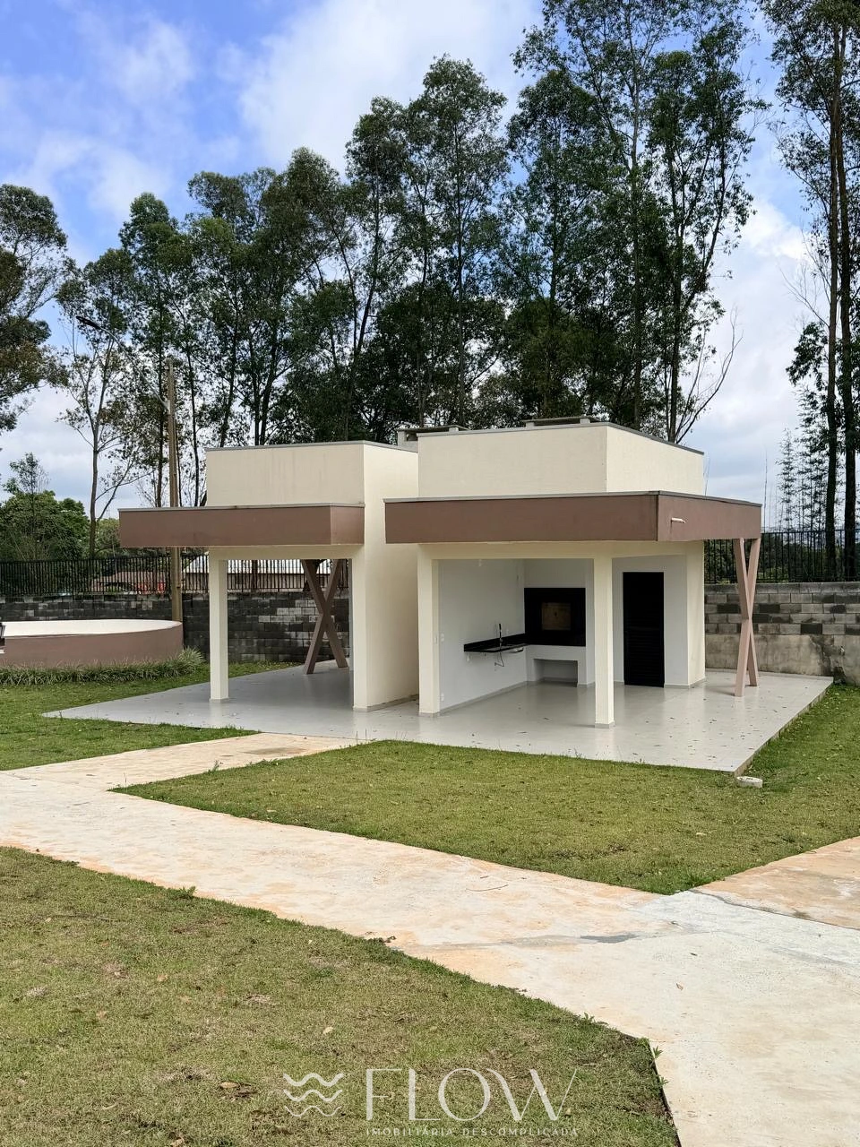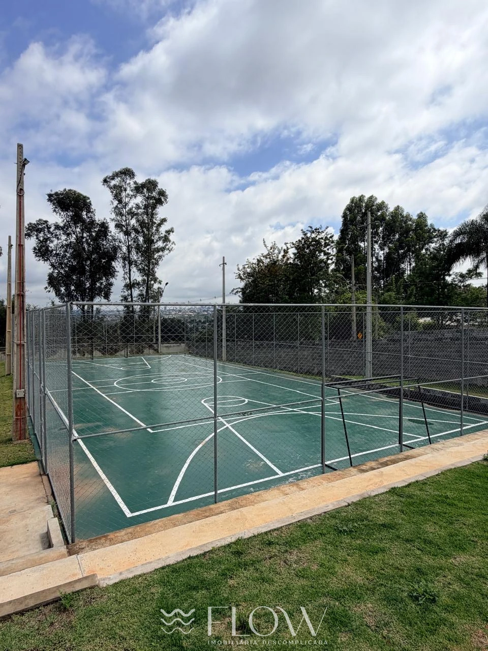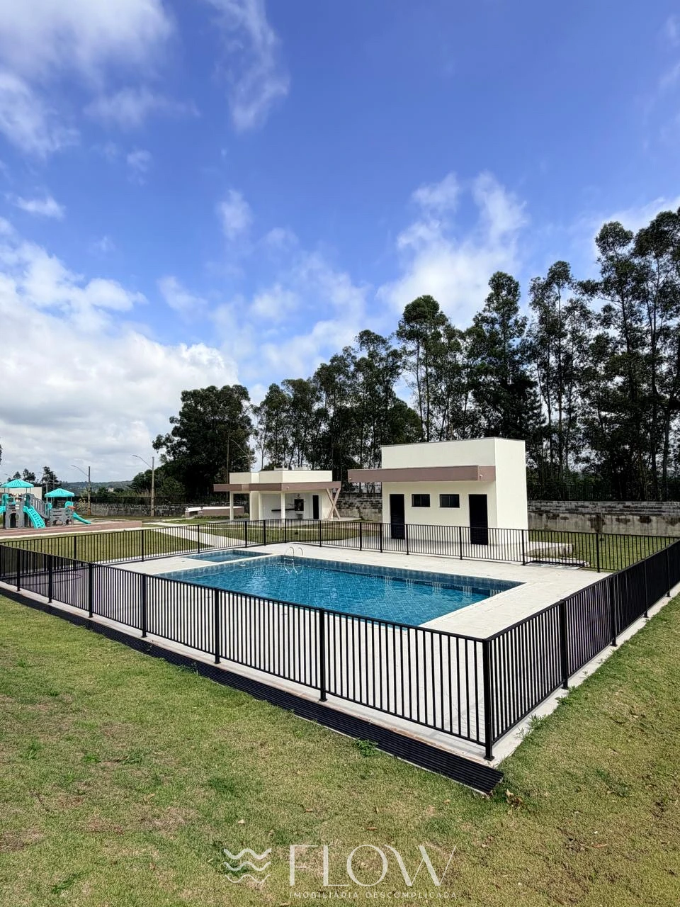 - Condomínio com piscina, salão de festa, quiosque com churrasqueira, quadra poliesportiva e playground